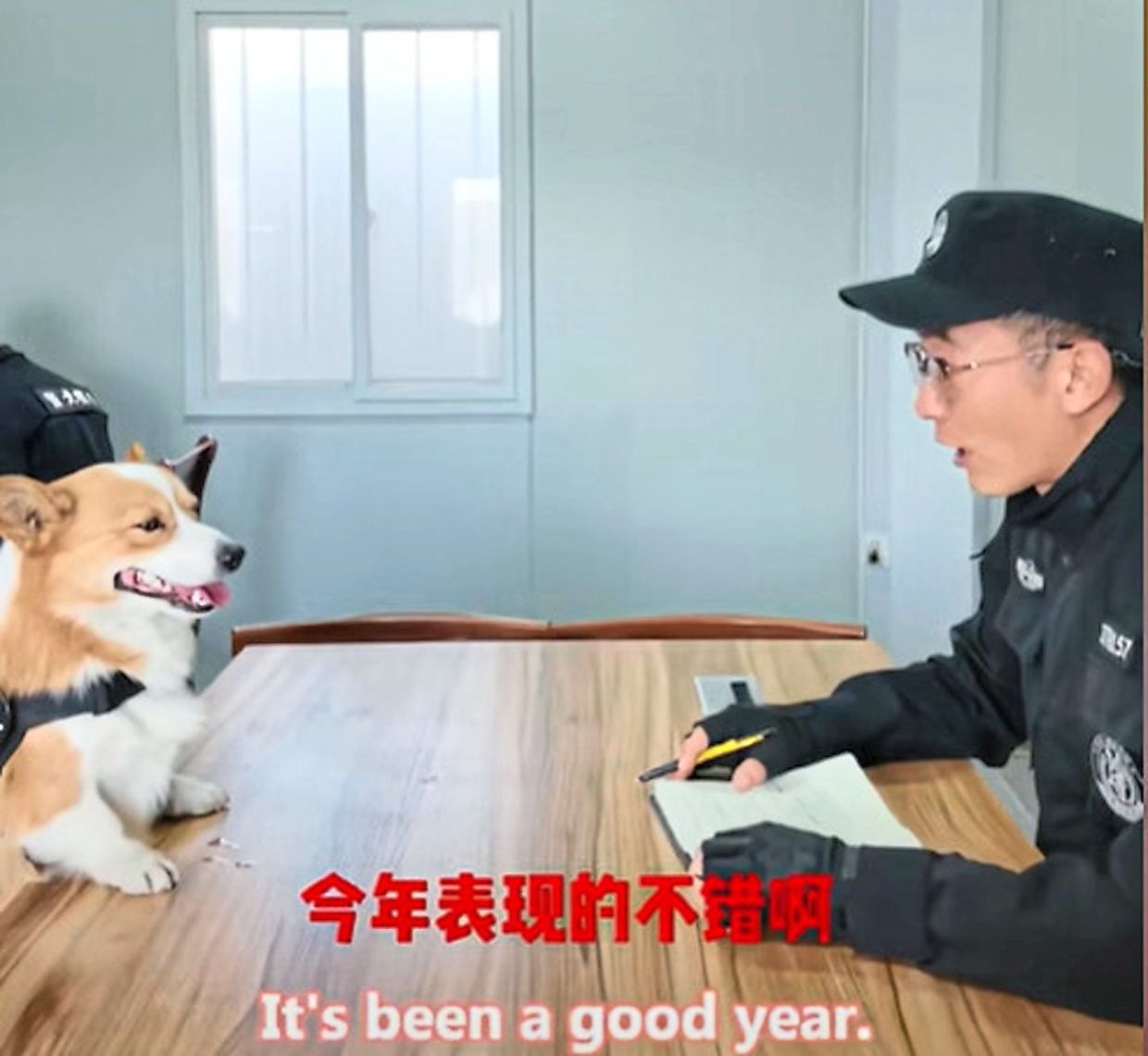 In the video, Fu Zai is seen sitting across the table from a police officer, who commends the beloved corgi for raising the profile of other Weifang canine dogs.