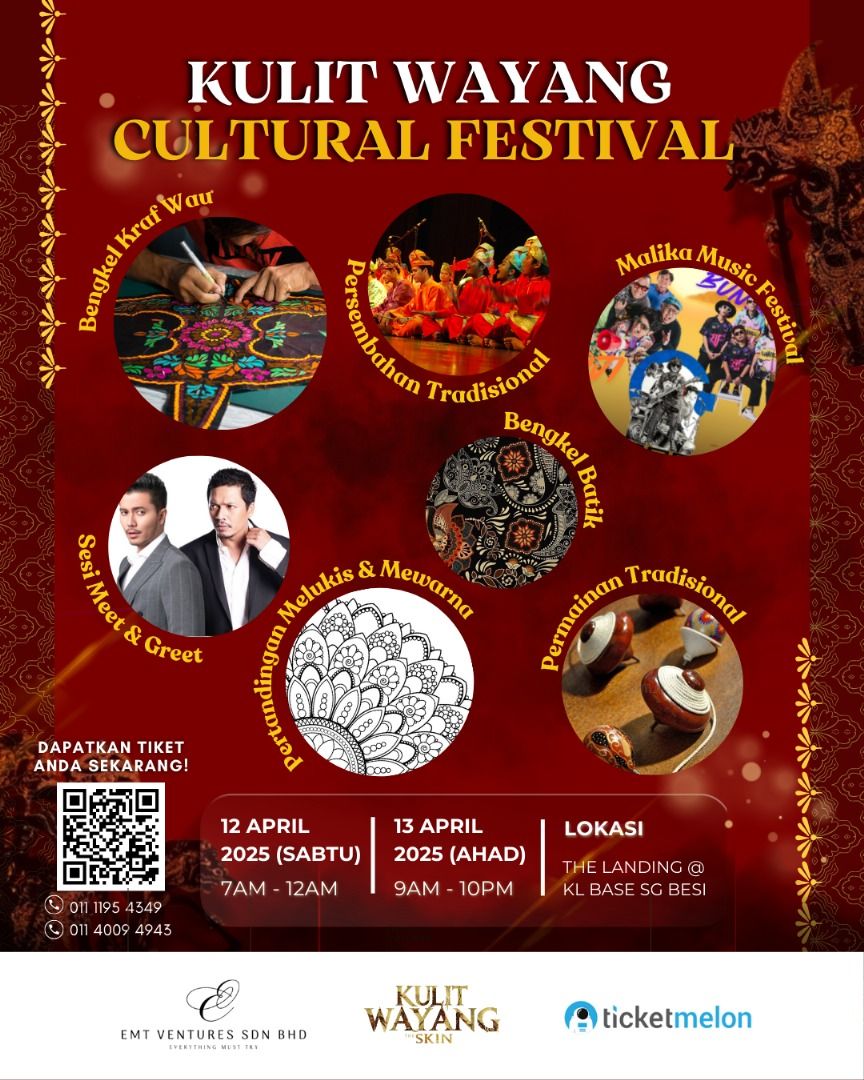 The two-day Kulit Wayang Cultural Festival which takes place at The Landing @ KL Base in Sungai Besi on 12th & 13th April 2025 seamlessly integrates a movie launch and trailer premiere, a 3km celebrity fun run, a vibrant cultural festival and the Malika Music Festival (which will be held on 12th April 2025), as part of a unique promotional campaign for the upcoming scream flick “Kulit Wayang”.
