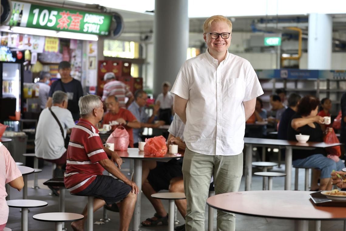 Lately, as Liu makes his rounds at the food centre at Blk 105 Hougang Avenue 1, he has been caught off guard by store owners calling him “dua gu” before chatting with him in Teochew. “Dua gu” means “big cow” – a Teochew translation of the Mandarin term “da niu”, which sounds like his name, Daniel. Given his albinism, dialect banter is something he rarely encounters.