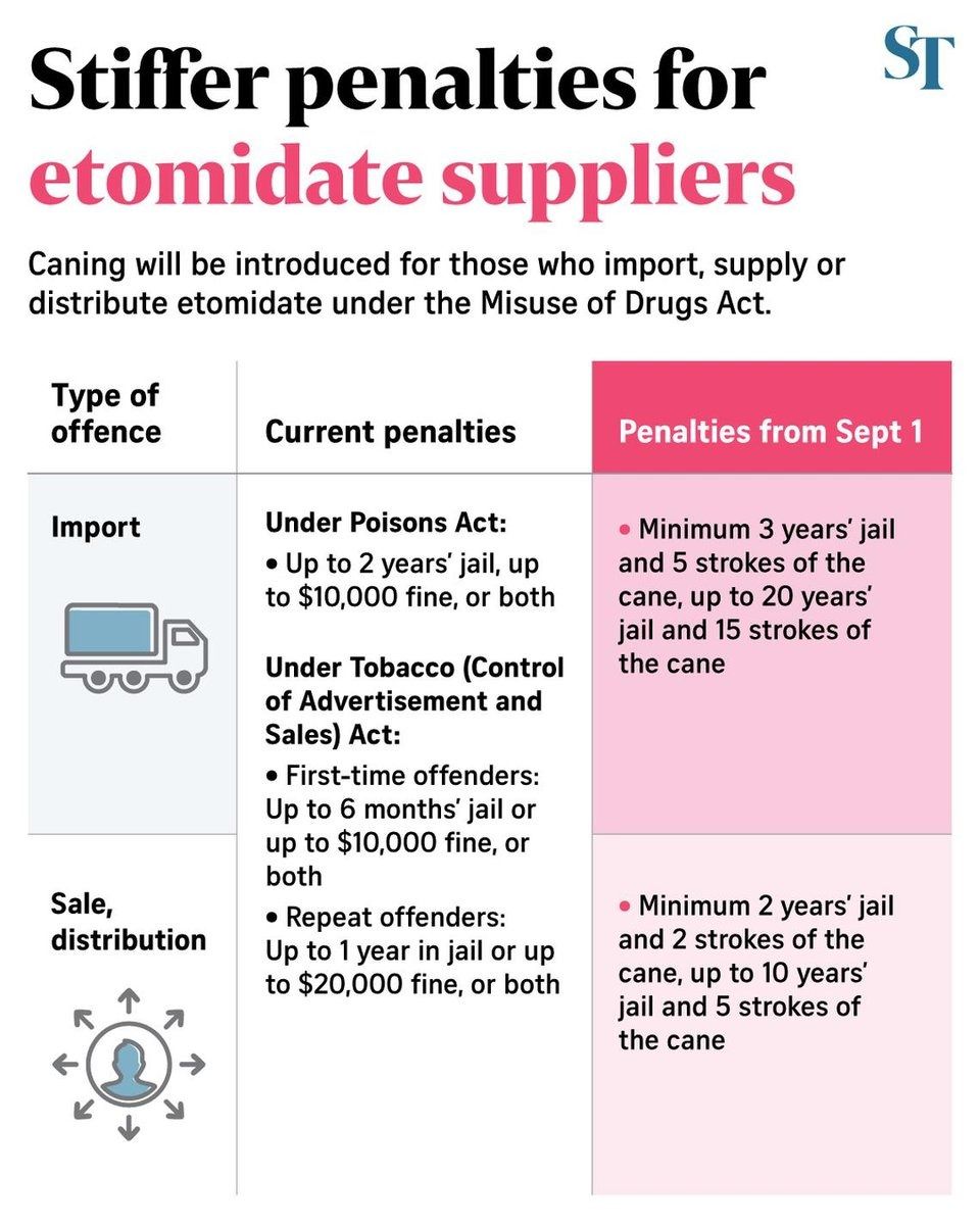 Currently, those caught importing, selling or distributing etomidate are prosecuted under the Poisons Act and do not face caning. They can be fined up to $10,000 and jailed for up to two years.