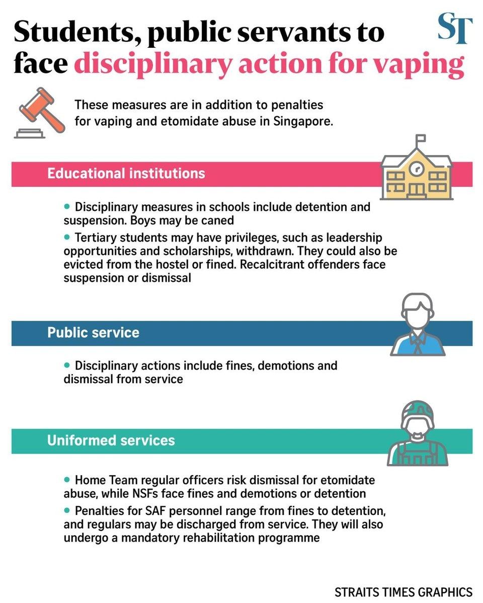 Uniformed officers who are regulars from the Home Team and the Singapore Armed Forces who commit vaping-related offences can be demoted or dismissed, and fined. National servicemen can face detention.