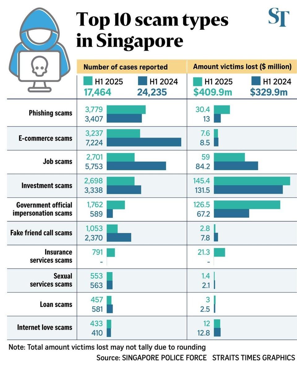 While the number of investment scam cases fell almost 20 per cent to 2,698 in the first half of 2025, the amount lost was the highest among all scam types. More than $145 million was lost from January to June in 2025, an increase from the $131.5 million in the same period in 2024.