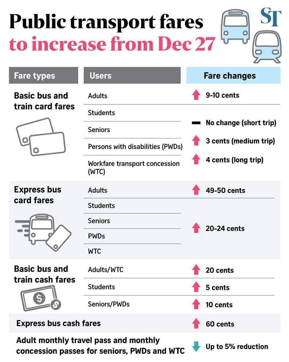 For instance, an adult who now pays $2.37 for a 10km express bus ride will fork out $2.86 from Dec 27. A senior who now forks out $1.48 for the same ride will pay $1.72.