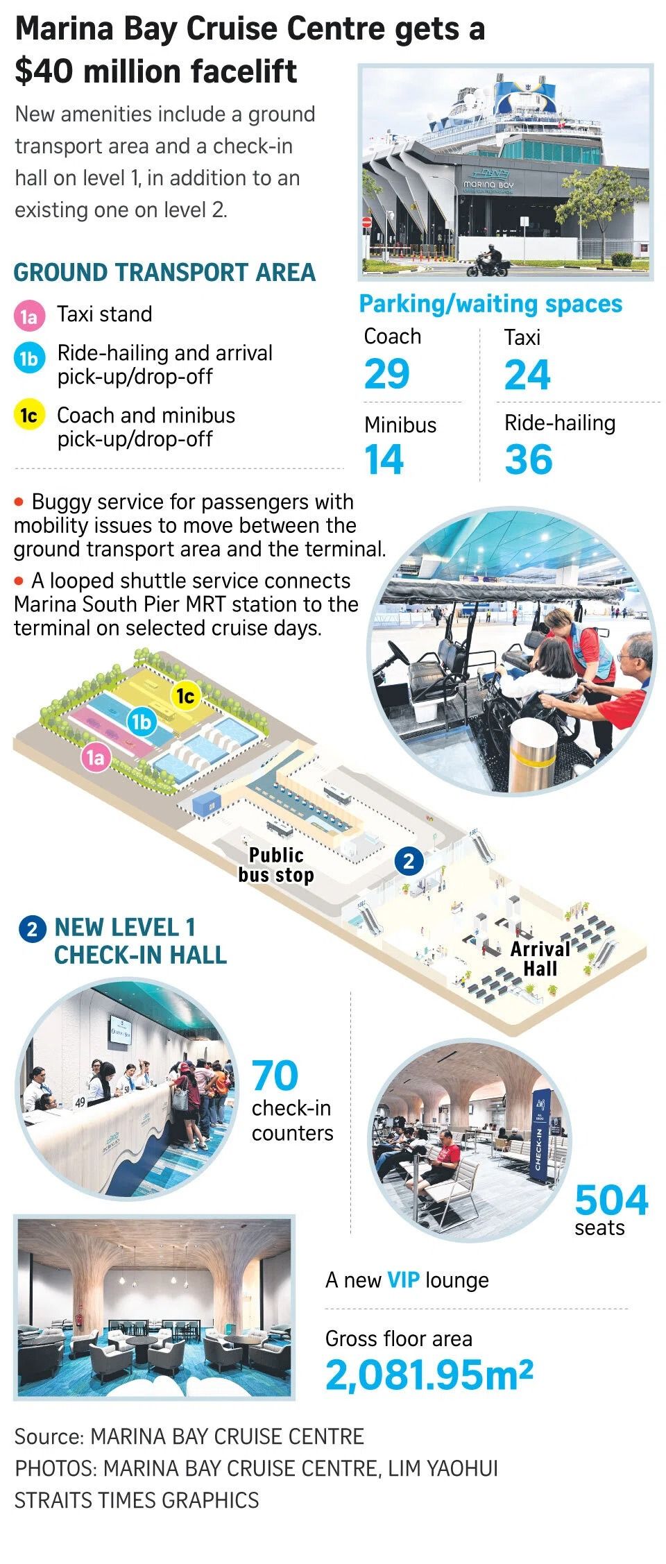 Ride-hailing waiting spaces have also more than doubled to 36, said Sats-Creuers Cruise Services and STB, and there are now 14 minibus parking spaces and 24 taxi waiting spaces.