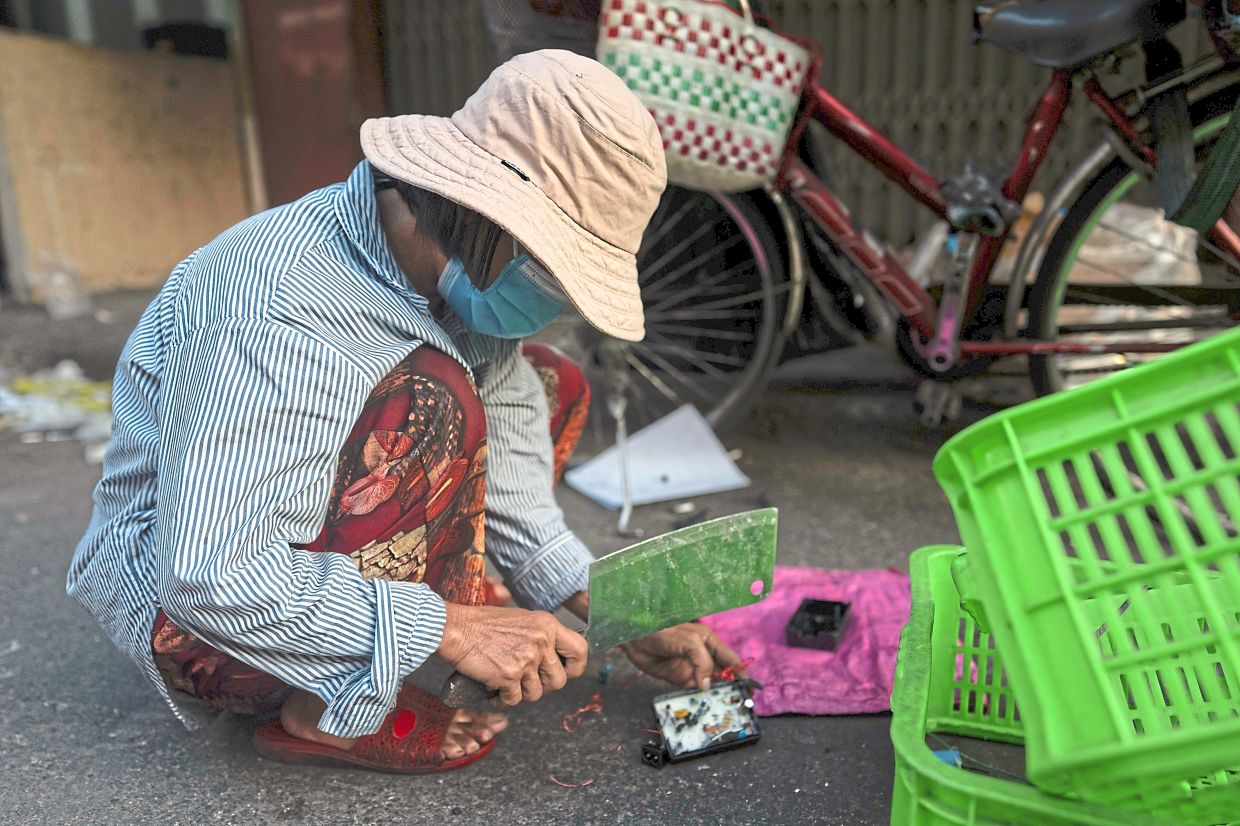 Don’t scrap it:Thai officials showing samples of illegally imported electronic waste from the United States they seized, during a press conference in Bangkok, Thailand, and an e-waste collector using a cleaver to remove copper wire from a device in Nhat Tao market, the largest informal recycling market in Ho Chi Minh City, Vietnam. — AP