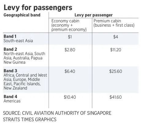 Passengers in economy or premium economy class will pay between S$1 and S$10.40, depending on their destination. Those who fly business or first class will pay between S$4 and S$41.60.
