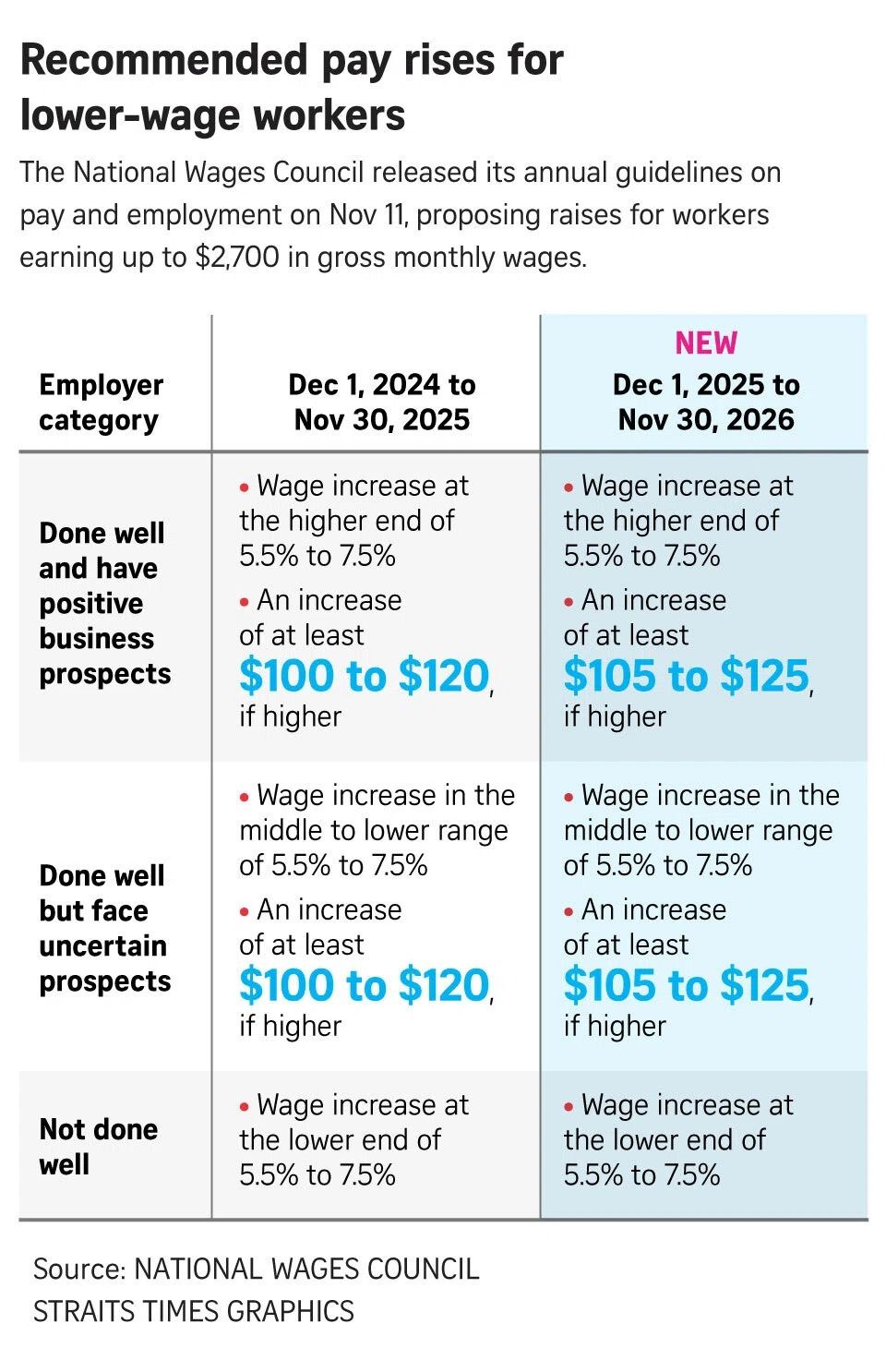 SINGAPORE (The Straits Times/ANN): Lower-wage workers earning up to $2,700 a month should receive a pay bump of 5.5 per cent to 7.5 per cent from their bosses, said the National Wages Council (NWC) of Singapore on Tuesday (Nov 11) in its annual guidelines on pay and employment issues.