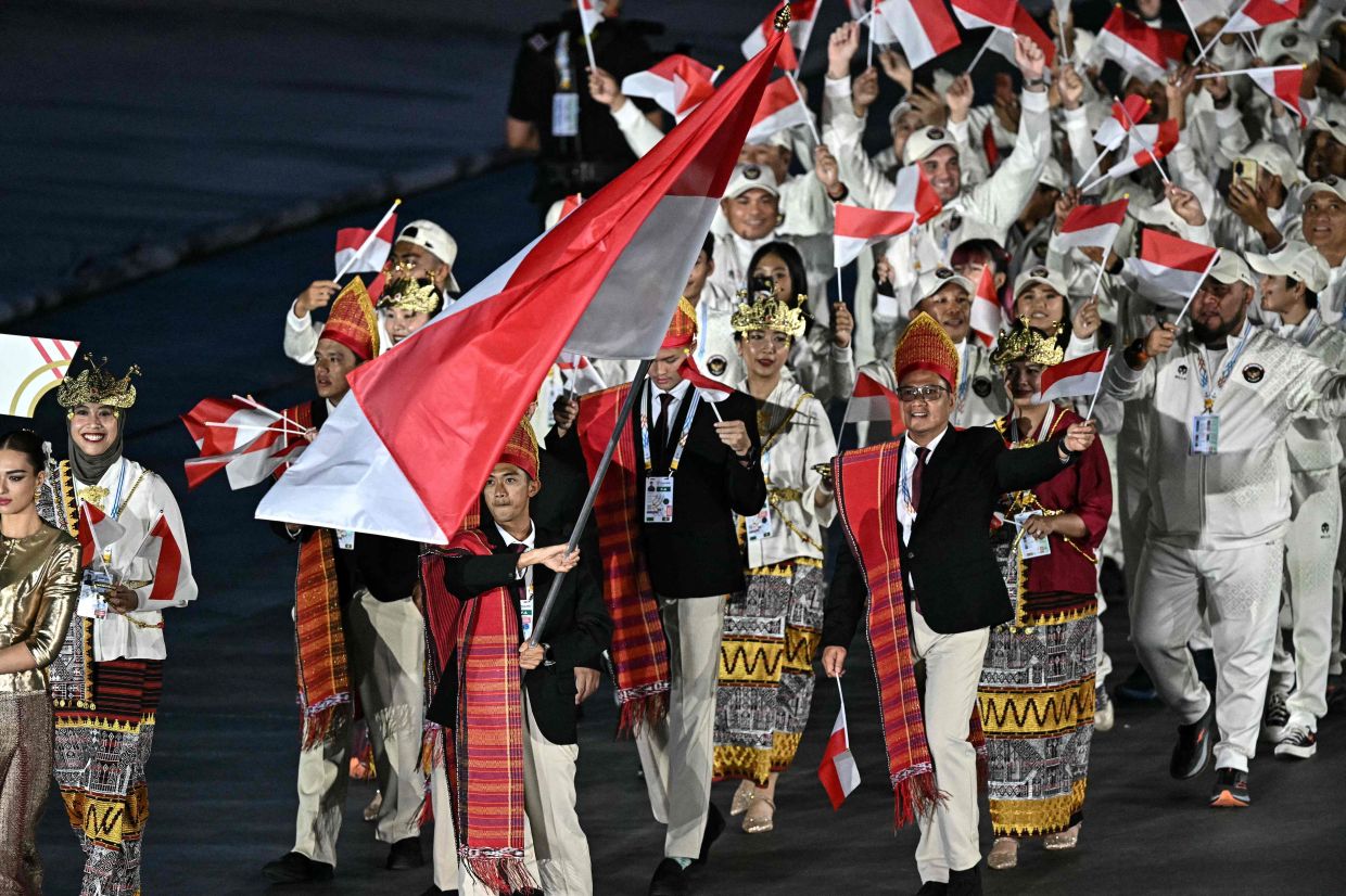 Malaysia's team members hold flags during the opening ceremony of the 33rd South-East Asian Games in Bangkok, Thailand, Tuesday, Dec. 9, 2025. -- AP Photo/Achmad Ibrahim