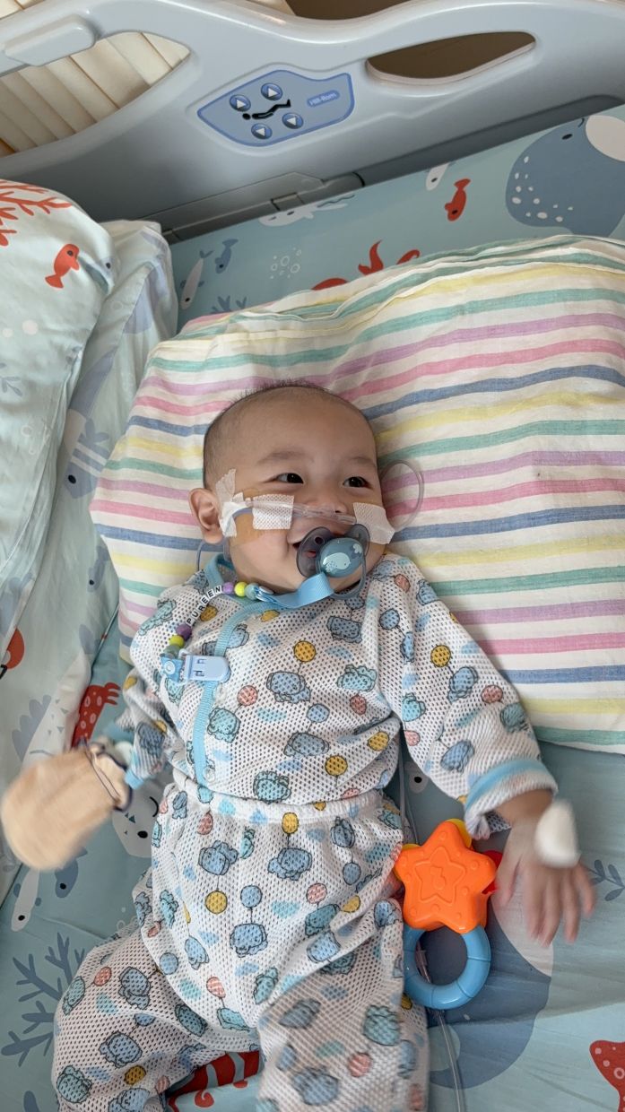 Because his heart cannot cope, Jia Wei suffers from severe growth and developmental delays. He is much smaller than babies his age and can only be fed through a nasogastric tube.