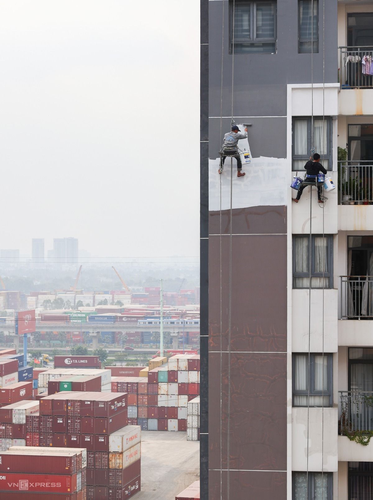 Among them was 32-year-old Truong Van Luu (L), who noted that the weeks leading up to Tet are the most lucrative of the year. During this pre-holiday rush, many buildings undergo extensive maintenance and major clean-ups, providing high-rise painters with their busiest and most stable period of income.