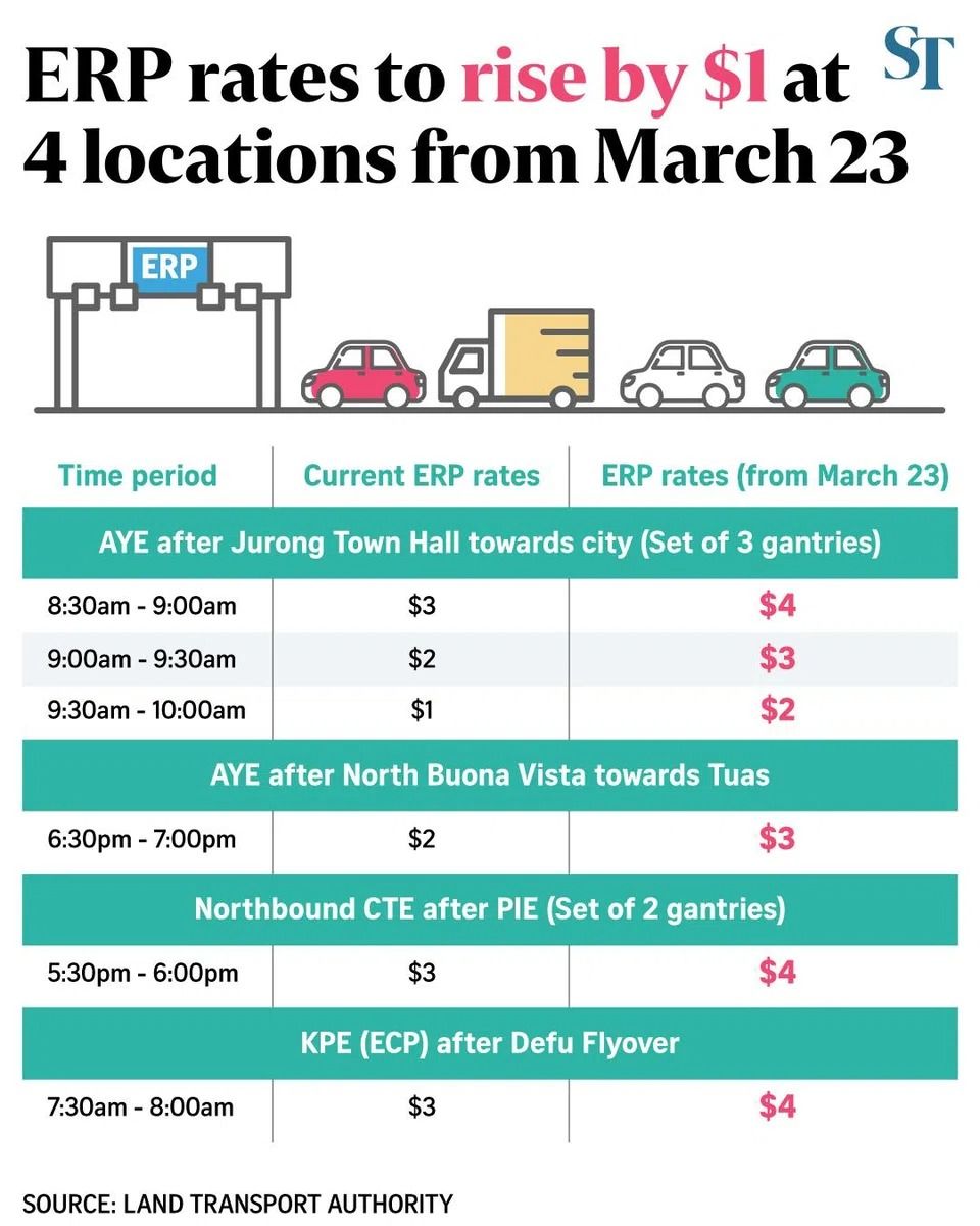 SINGAPORE: Motorists can expect Electronic Road Pricing (ERP) rates at four locations to increase by S$1 from March 23, said the Land Transport Authority (LTA) in a statement on Thursday (March 12).