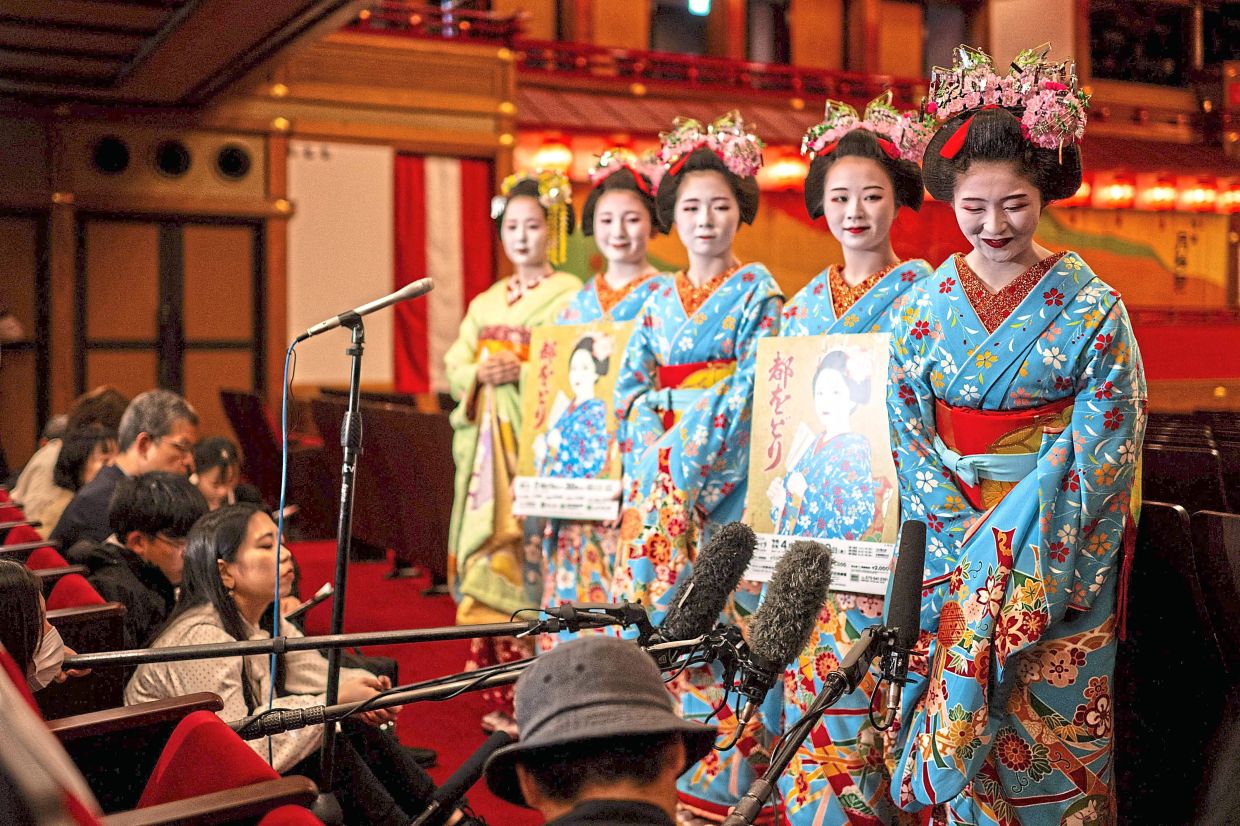 Against a backdrop of blooming cherry blossoms, a group of geishas elegantly shuffle onto a stage in Kyoto city to begin a centuries-old performance celebrating the arrival of spring.