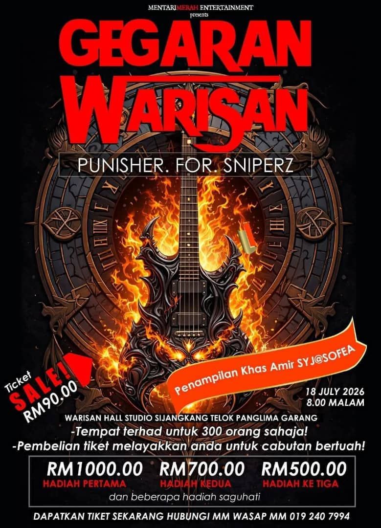 Fans of hard rock music in the country will be treated to an adrenaline-filled night when the Gegaran Warisan concert is announced to take place on July 18, 2026, at 8pmat Warisan Hall Studio, Sijangkang, Telok Panglima Garang.