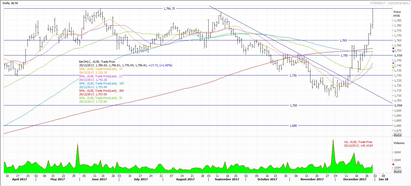 There was more excitement on Wednesday, however, as the FBM KLCI jumped 11.77 points or two-thirds of a percent to 1,771.67 points. This saw the index surpass the key 1,765 resistance level, coming within striking distance of the 1,800-point target some analysts had forecast.