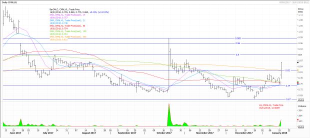 To the lower end of the chart, a correction could see the stock return to the 82 sen mark before being drawn further to the 74 to 75 sen level. Falling though that, the counter could travel to 71 sen and the recent low of 67 sen.