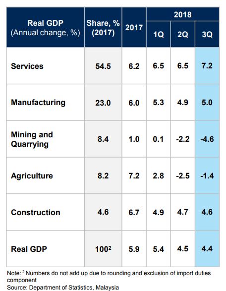 For the first three quarters of 2018, Malaysia’s GDP registered a growth of 4.7% with a value of RM907.2bil at constant prices and RM1,055.2bil at current prices.