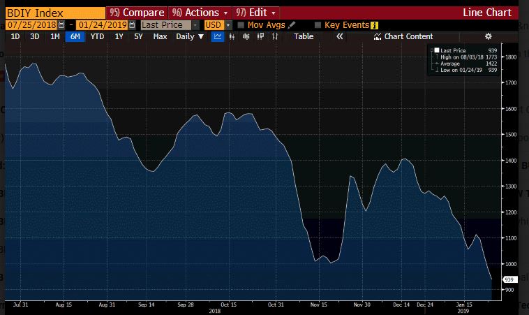 The Baltic Dry Index, measure of ship transport costs for materials like iron ore and coal, has fallen by 47 percent since mid-2018, when a trade dispute between the United States and China resulted in the world's two biggest economies slapping import tariffs on each other's goods.