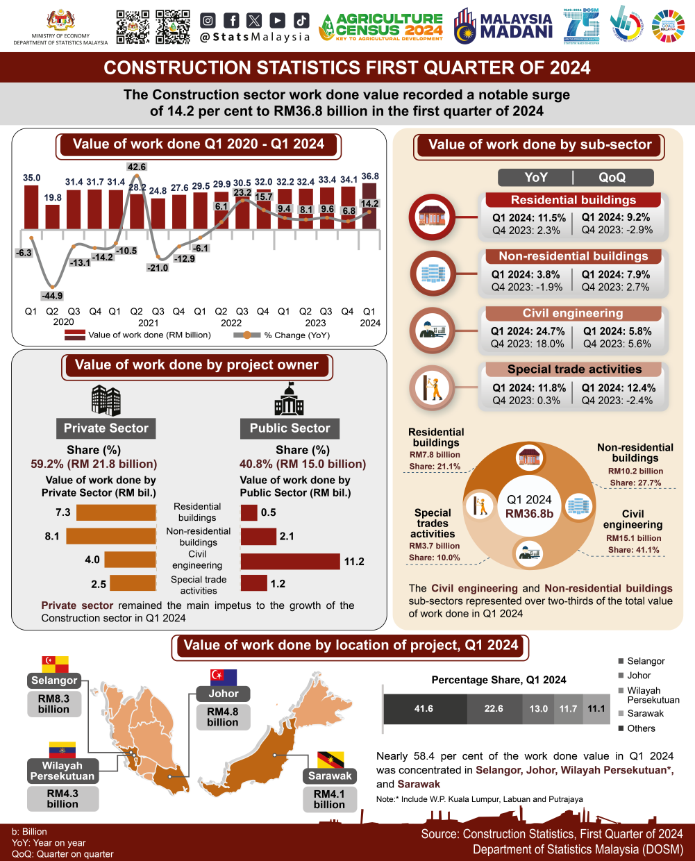 The value of work done by the public sector reached RM15.0 billion or 40.8 per cent, which maintained its double-digit growth for three consecutive quarters by registering 20.6 per cent this quarter.