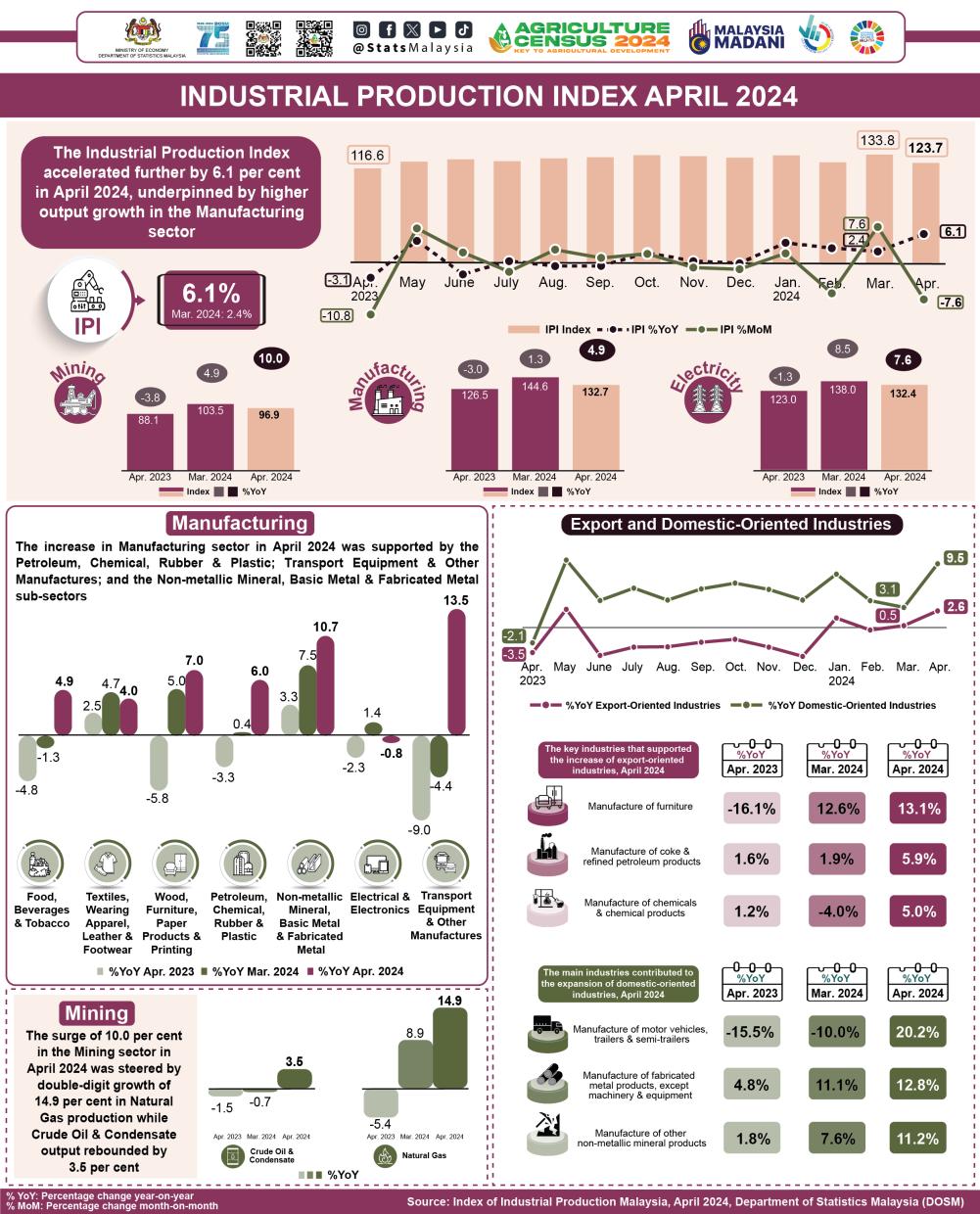 KUALA LUMPUR: Malaysia’s Industrial Production Index (IPI) accelerated 6.1 per cent year-on-year in April 2024, underpinned by higher output growth in the manufacturing sector, according to the Department of Statistics Malaysia (DOSM).