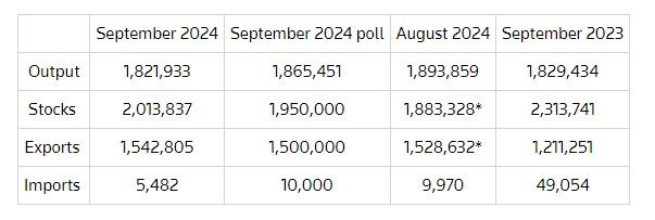 A Reuters survey had forecast inventories at 1.95 million metric tons, with output seen at 1.87 million tons and exports at 1.5 million tons.