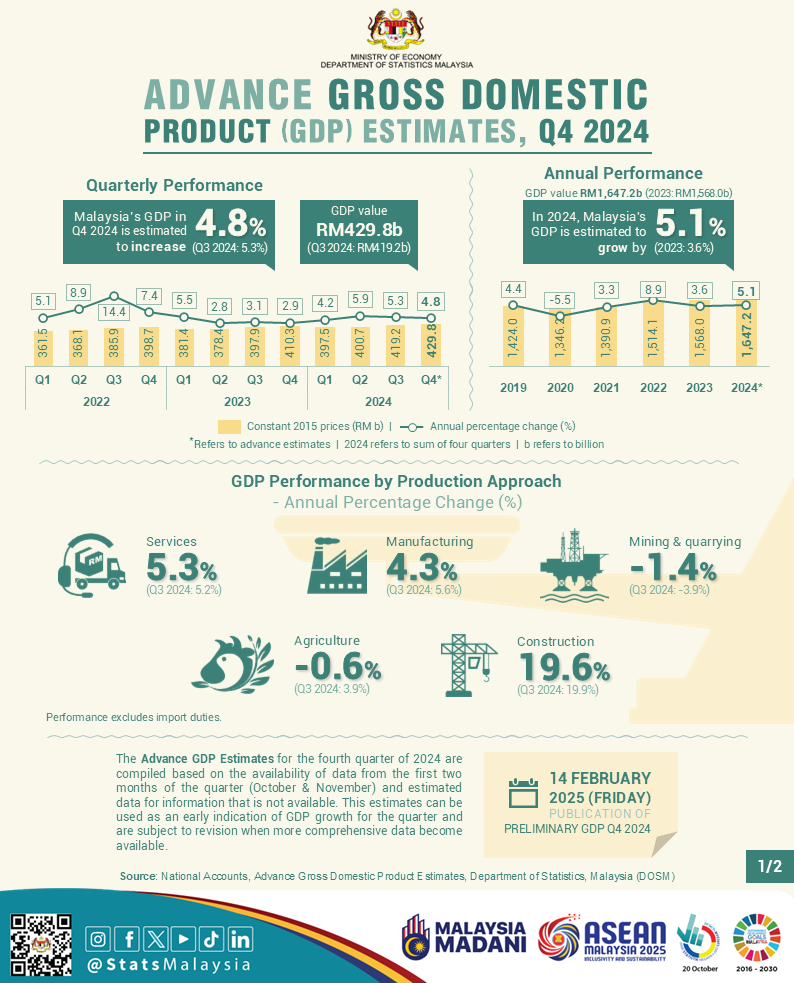 The growth is expected to be driven by the 4.8 per cent growth in the fourth quarter of 2024 (4Q 2024) following a stronger 5.3 per cent growth in 3Q 2024, DOSM said in its 4Q 2024 advance GDP estimates released today.