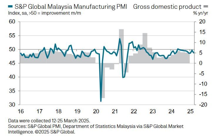 S&P Global Market Intelligence's Usamah Bhatti said Malaysian manufacturers remained under pressure at the end of the first quarter of 2025, as the latest PMI data indicated a slightly steeper moderation in operating conditions for the sector.