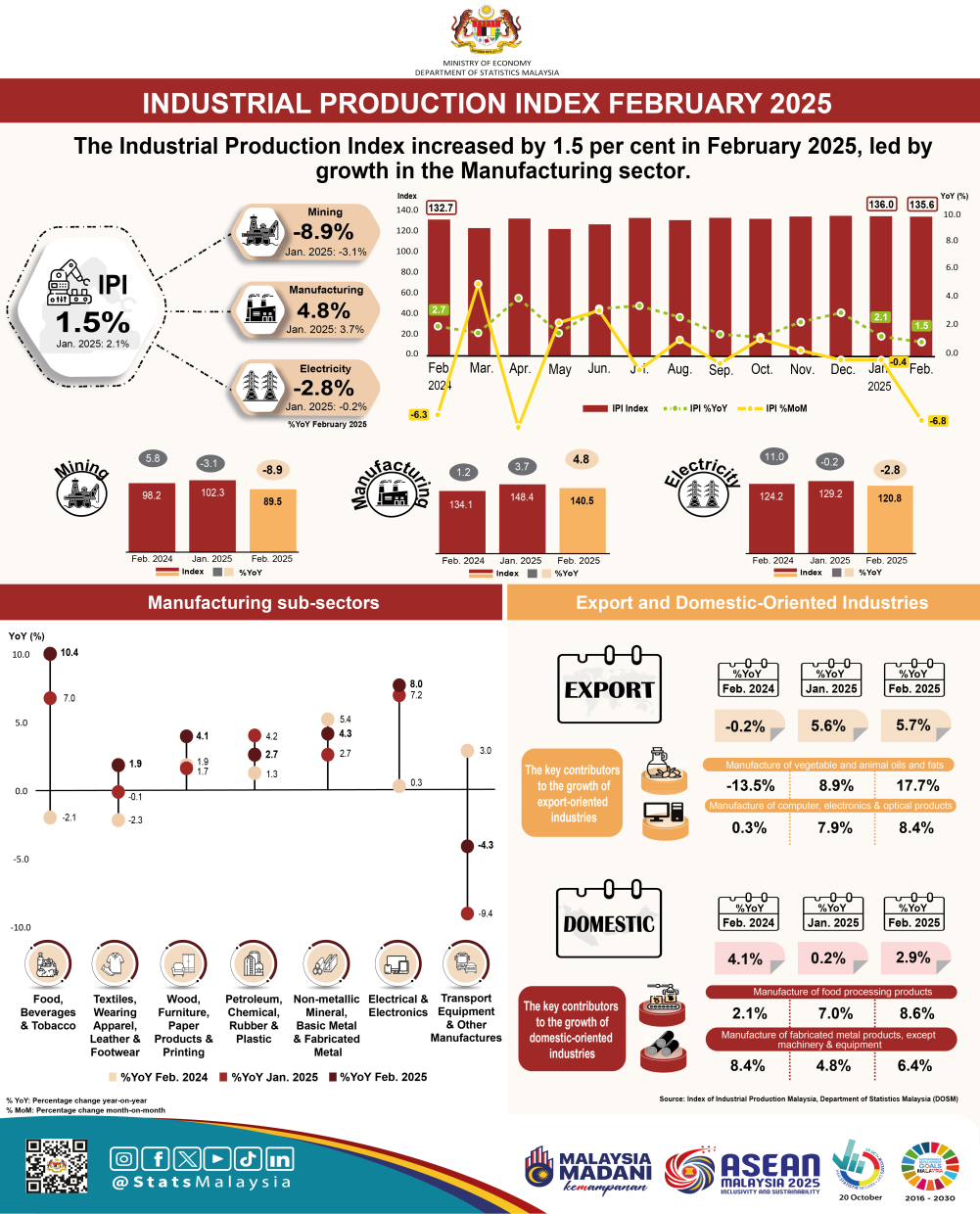 KUALA LUMPUR: Malaysia’s Industrial Production Index (IPI) increased by 1.5 per cent year-on-year in February 2025, driven by a rise in the manufacturing sector, according to the Statistics Department Malaysia (DOSM).
