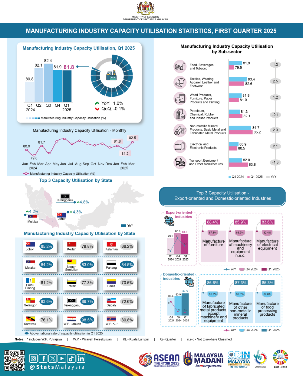 KUALA LUMPUR: Malaysia’s manufacturing industry capacity utilisation reached 81.8 per cent in the first quarter of 2025 (1Q 2025), increasing 1.0 percentage points from the 80.08 per cent recorded in the same quarter of the preceding year, said the Department of Statistics Malaysia (DOSM)