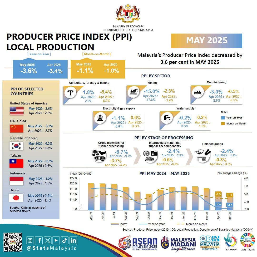 KUALA LUMPUR: Malaysia’s Producer Price Index (PPI) declined by 3.6 per cent in May 2025, following a 3.4 per cent decrease in April, according to the Department of Statistics Malaysia (DOSM).