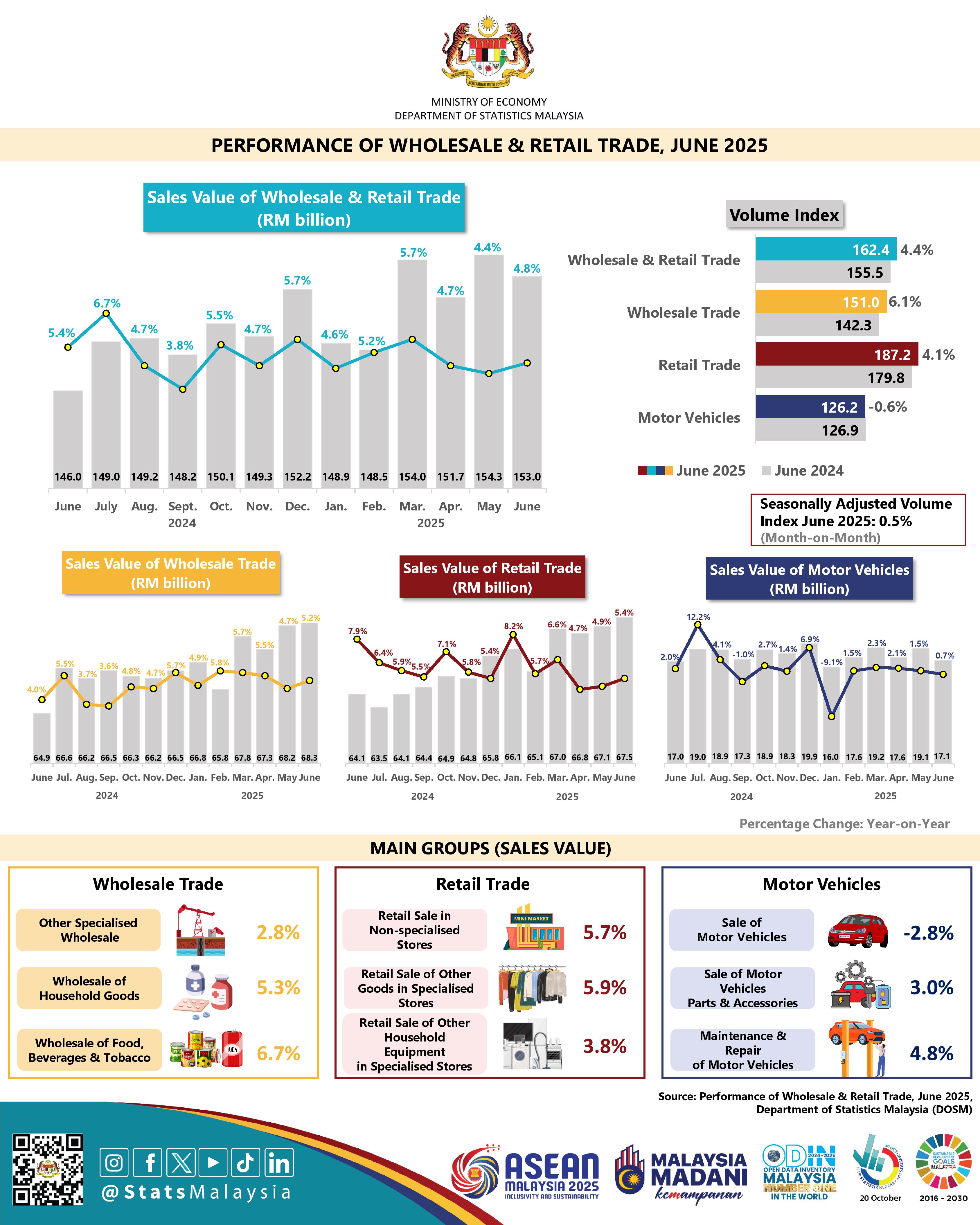 KUALA LUMPUR: Wholesale and retail trade recorded a steady growth of 4.8 per cent in June 2025, with sales at RM153.0 billion, according to the Department of Statistics Malaysia (DOSM).