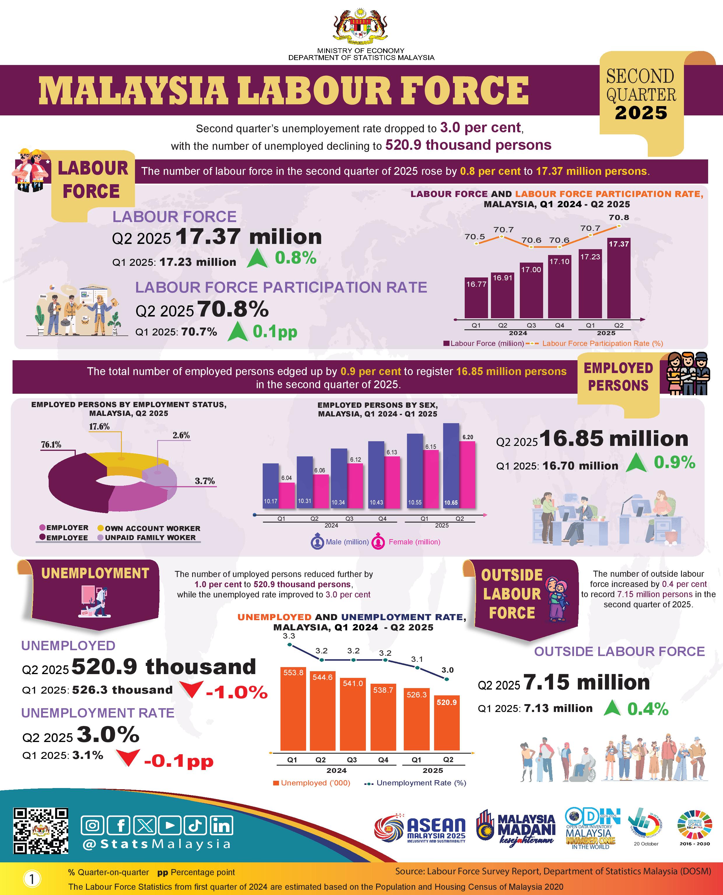 “Thus, the labour force continued its upward trend in June 2025, increasing by 0.3% month-on-month to 17.43 million persons. The labour force participation rate (LFPR) in June 2025 stood at 70.8%, consistent with the rate recorded in May,” Mohd Uzir said in a statement.