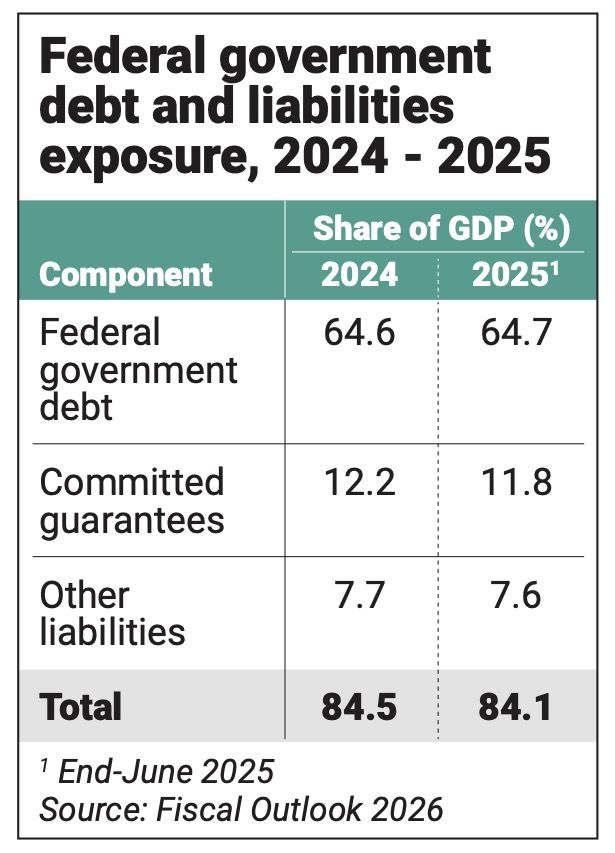 THE combined debt and liabilities exposure as at end-June 2025 amounted to RM1,694.6bil,or 84.1% of gross domestic product (GDP), according to the Fiscal Outlook 2026.