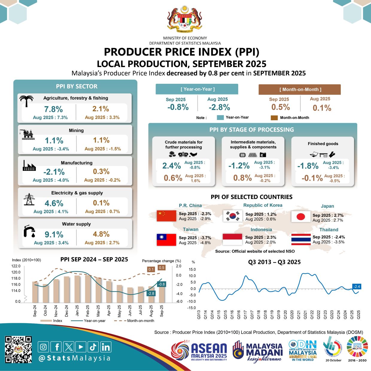 KUALA LUMPUR: Malaysia’s Producer Price Index (PPI), which measures price changes at the producer level, fell by 0.8 per cent in September 2025, easing from a 2.8 per cent decline in the previous month, according to the Department of Statistics Malaysia (DOSM).
