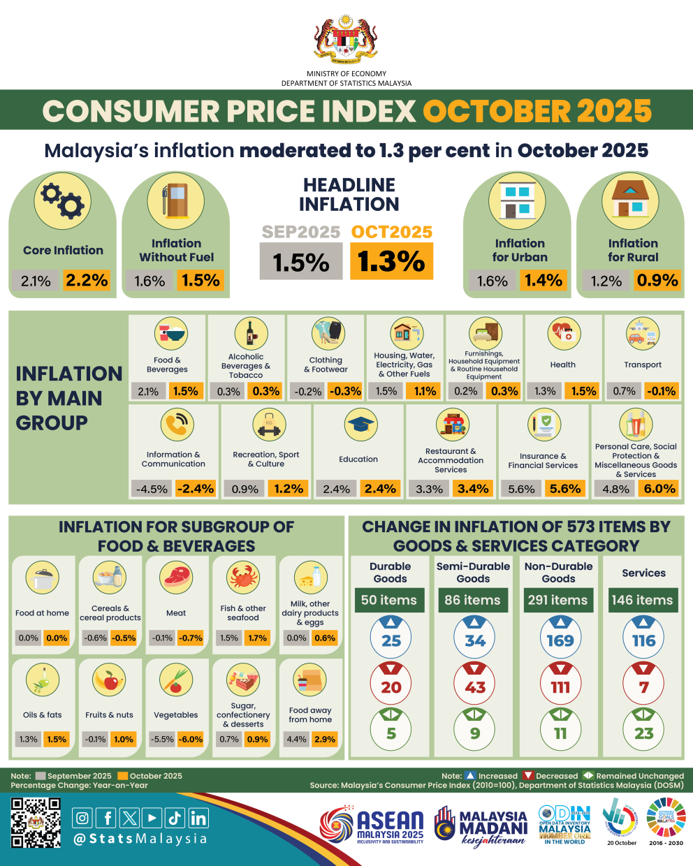In releasing the Consumer Price Index (CPI) for October 2025, DOSM said the moderation was mainly driven by slower price increases in the food and beverages group, which rose 1.5 per cent (Sept 2025: 2.1 per cent), and in the housing, water, electricity, gas and other fuels group, which recorded a 1.1 per cent increase (Sept 2025: 1.5 per cent).