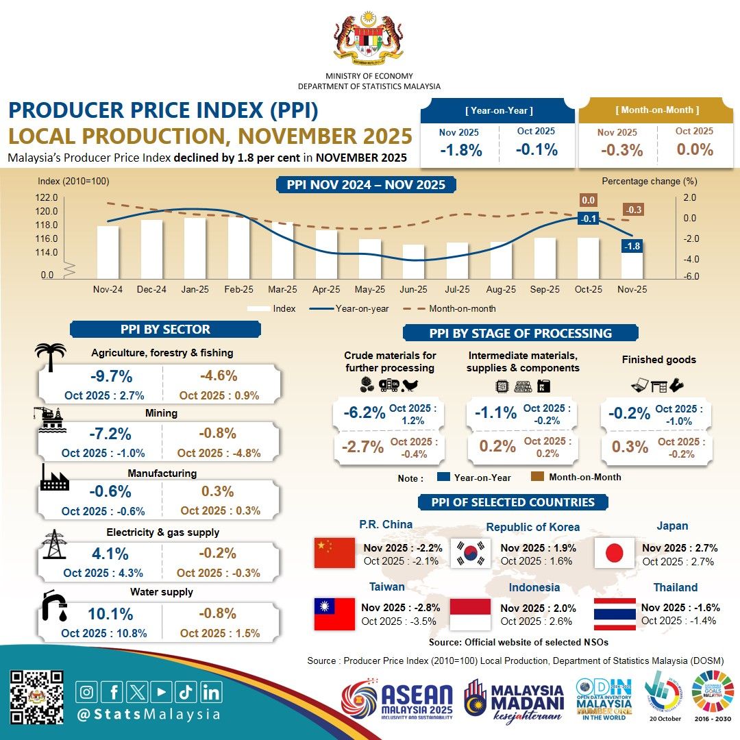 KUALA LUMPUR: Malaysia’s Producer Price Index (PPI) eased further by 1.8 per cent in November 2025 from a 0.1 per cent decrease in October 2025, said the Department of Statistics Malaysia (DOSM).