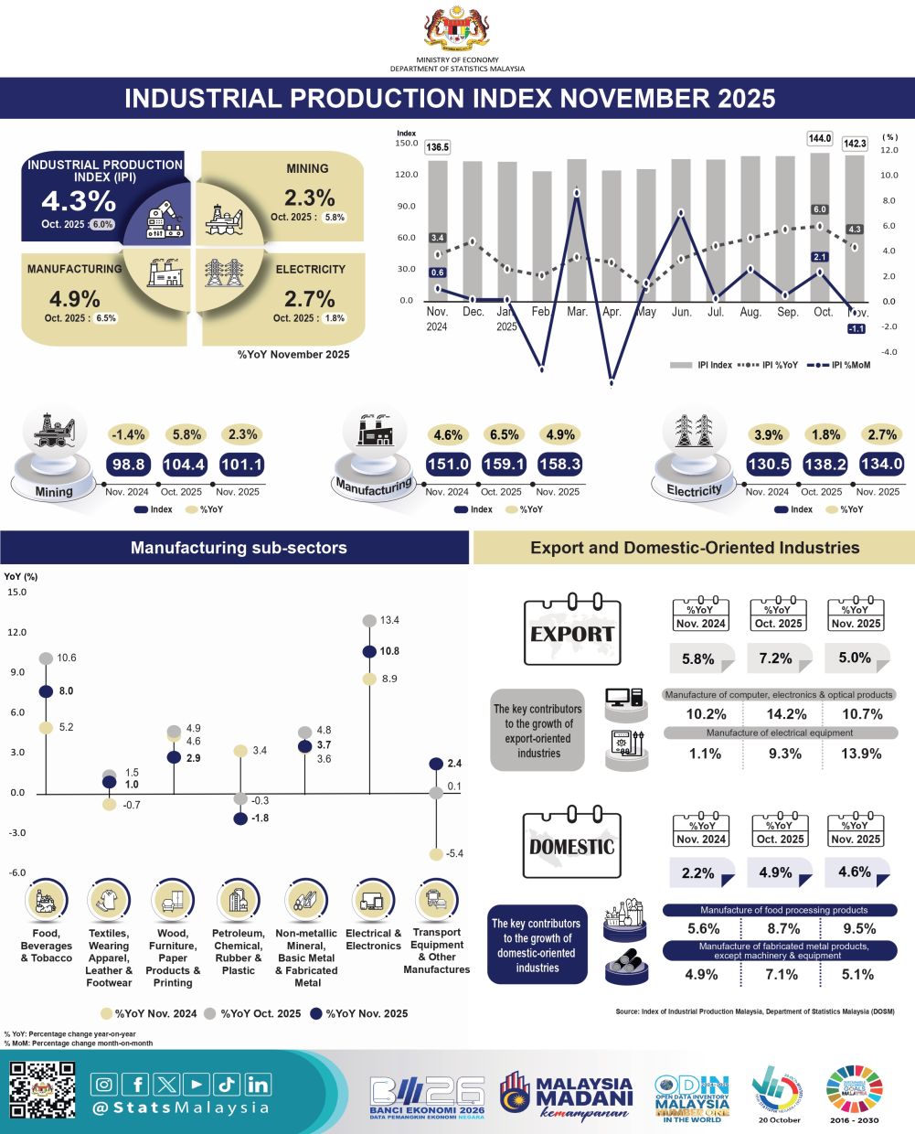 KUALA LUMPUR: Malaysia’s Industrial Production Index (IPI) rises 4.3 per cent year-on-year in November 2025, induced by positive momentum in all sectors, said the Department of Statistics, Malaysia (DOSM).