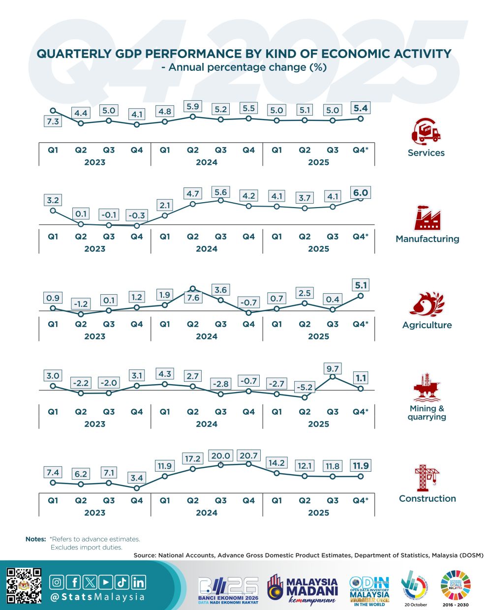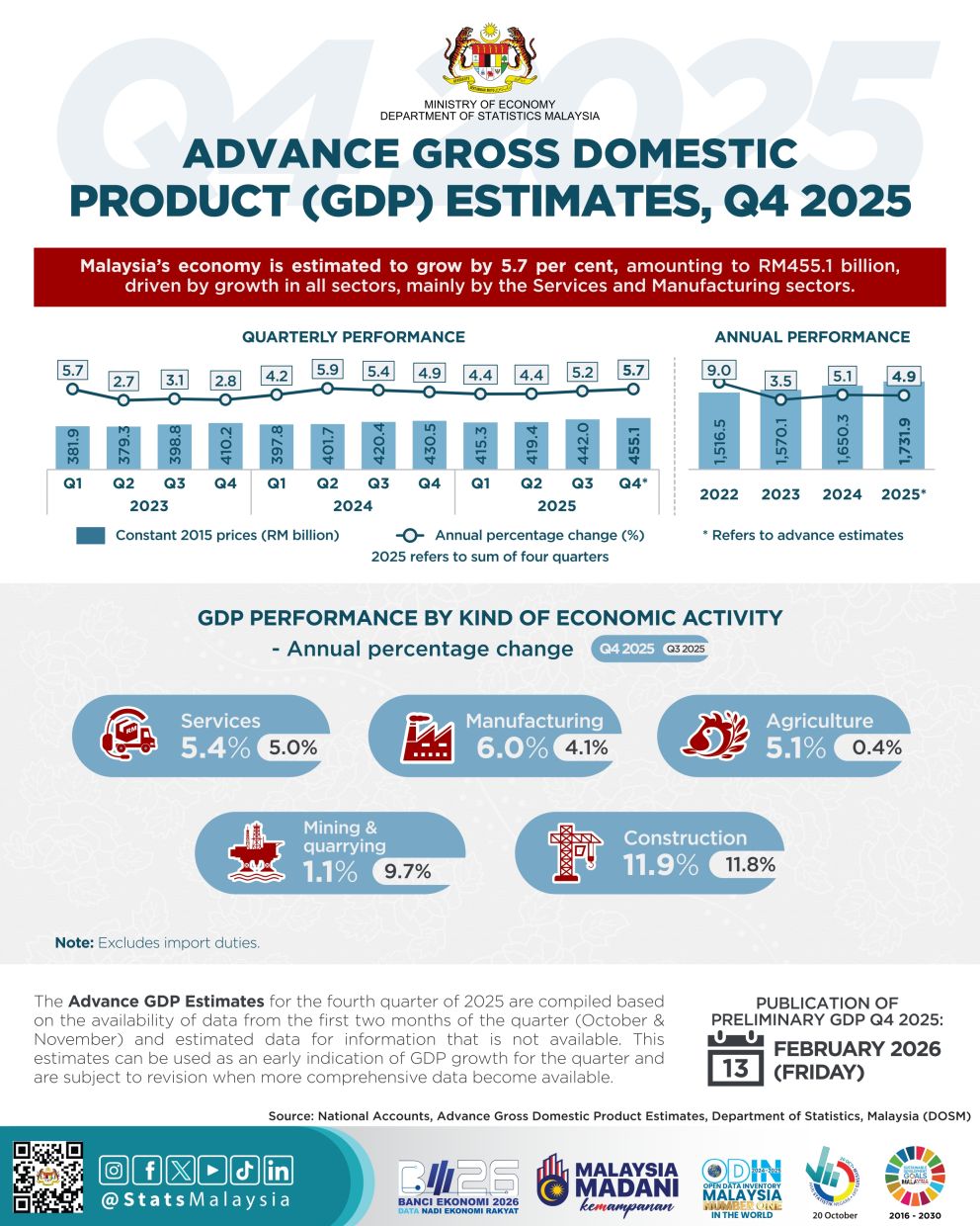 KUALA LUMPUR: Malaysia's economy is projected to have grown 5.7% in the fourth quarter of 2025, according to the advance estimate issued by the National Statistics Department ahead of the release of the actual gross domestic product (GDP) next month.