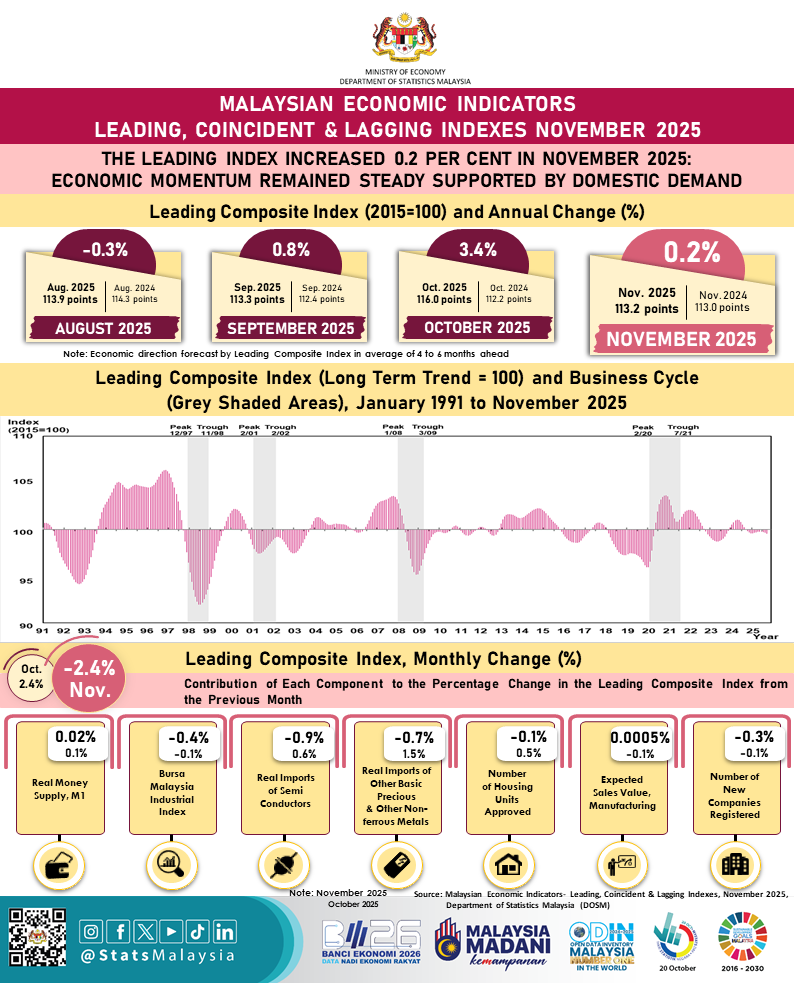 KUALA LUMPUR: Malaysia’s economic outlook moderated in November 2025, with the Leading Index (LI) increasing 0.2 per cent to 113.2 points from 113.0 points in the corresponding period last year, supported by domestic demand.
