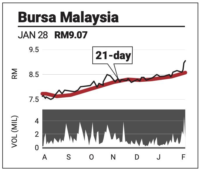 Resistance for the share is found at RM9.50, with higher resistance at RM10. Support lies at RM RM8.60 and RM8.39.