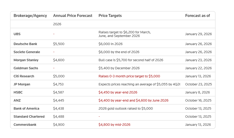 The latest round of forecast upgrades and reiterations came as spot gold hit an all-time high of $5,594.82 on Thursday.