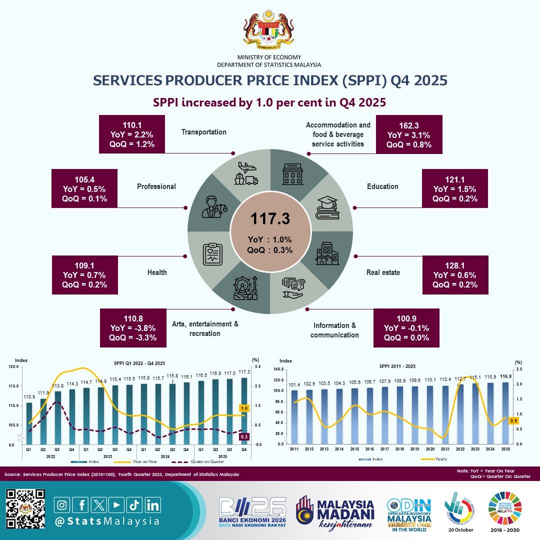 KUALA LUMPUR: Malaysia's Services Producer Price Index (SPPI) rose one per cent in the fourth quarter (4Q) of 2025, maintaining the same rate of increase for the third consecutive quarter, said Statistics Department Malaysia (DOSM) today.