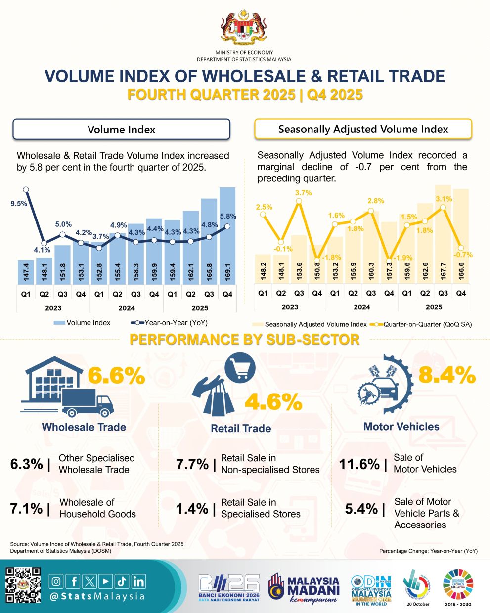 KUALA LUMPUR: Malaysia’s wholesale and retail trade registered total sales of RM163.7 billion in December 2025, a year-on-year (y-o-y) increase of 7.6 per cent, and this contributed to total annual sales of RM1.87 trillion in 2025, representing annual growth of 5.6 per cent.