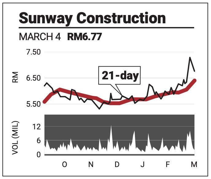 Overhead, the share is staring at a historical peak of RM7.40. Support remains at RM6.60 and RM6.20. Looking at the technical indices, while the slow-stochastic remains weak at 34 points, other indicators have started picking up to suggest the start of a consolidation period.