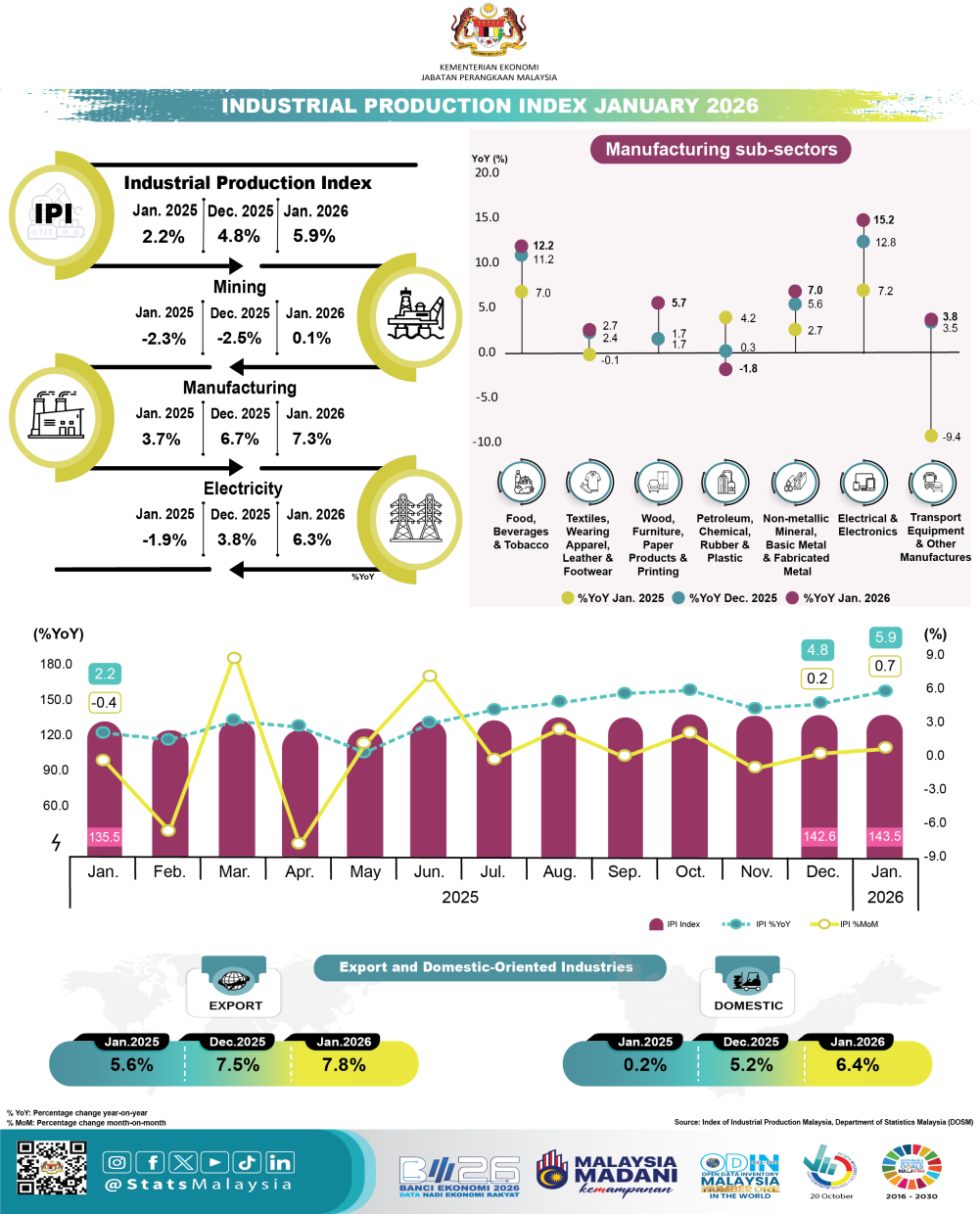 KUALA LUMPUR: Malaysia's industrial production index rose 5.9% in January from a year earlier, surpassing expectations, government data showed on Tuesday.