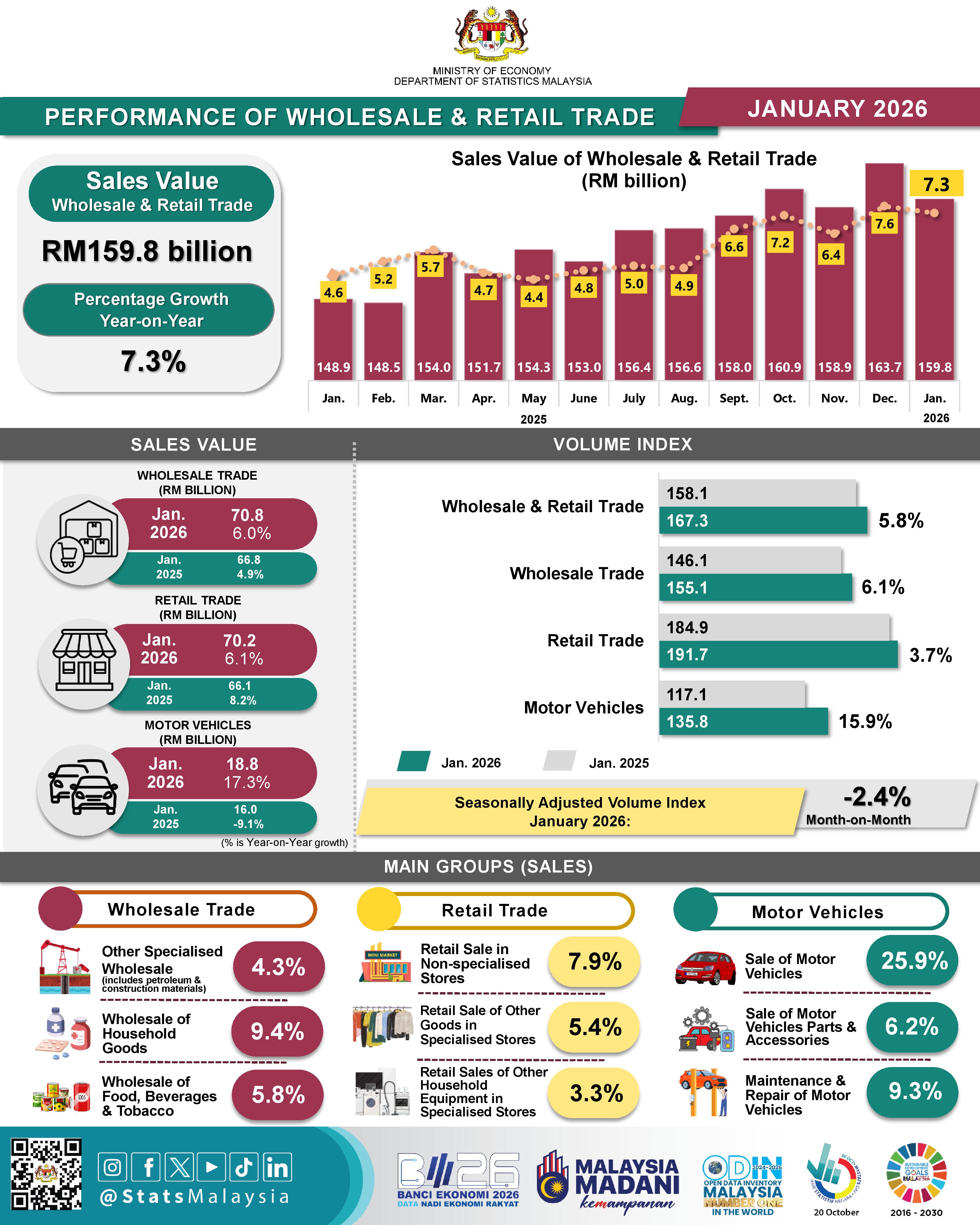 KUALA LUMPUR: Malaysia’s wholesale and retail trade sales rose 7.3 per cent year-on-year (y-o-y) to RM159.8 billion in January 2026, according to the Department of Statistics Malaysia (DOSM).