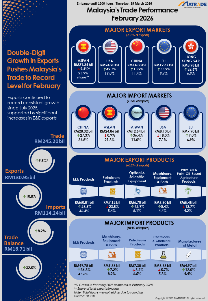 On export markets, Malaysia registered a surge in shipments to the US (42.3%) to RM24.9bil in February, as well as to China (13.2%) to RM14.88bil.
