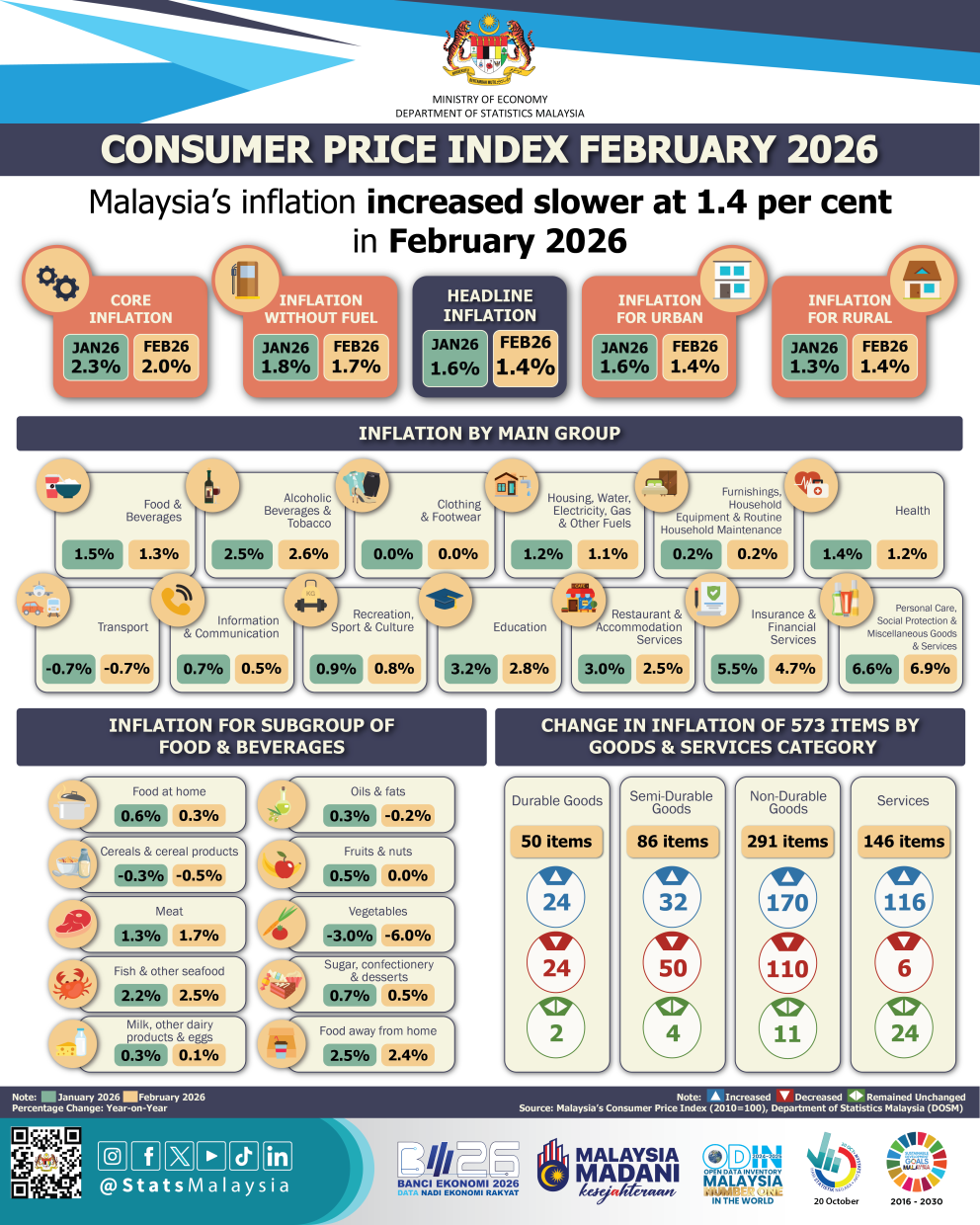 KUALA LUMPUR: Malaysia’s inflation rose modestly to 1.4 per cent in February 2026, with the consumer price index climbing to 136.0 from 134.1 a year earlier, the Department of Statistics Malaysia (DOSM) said.