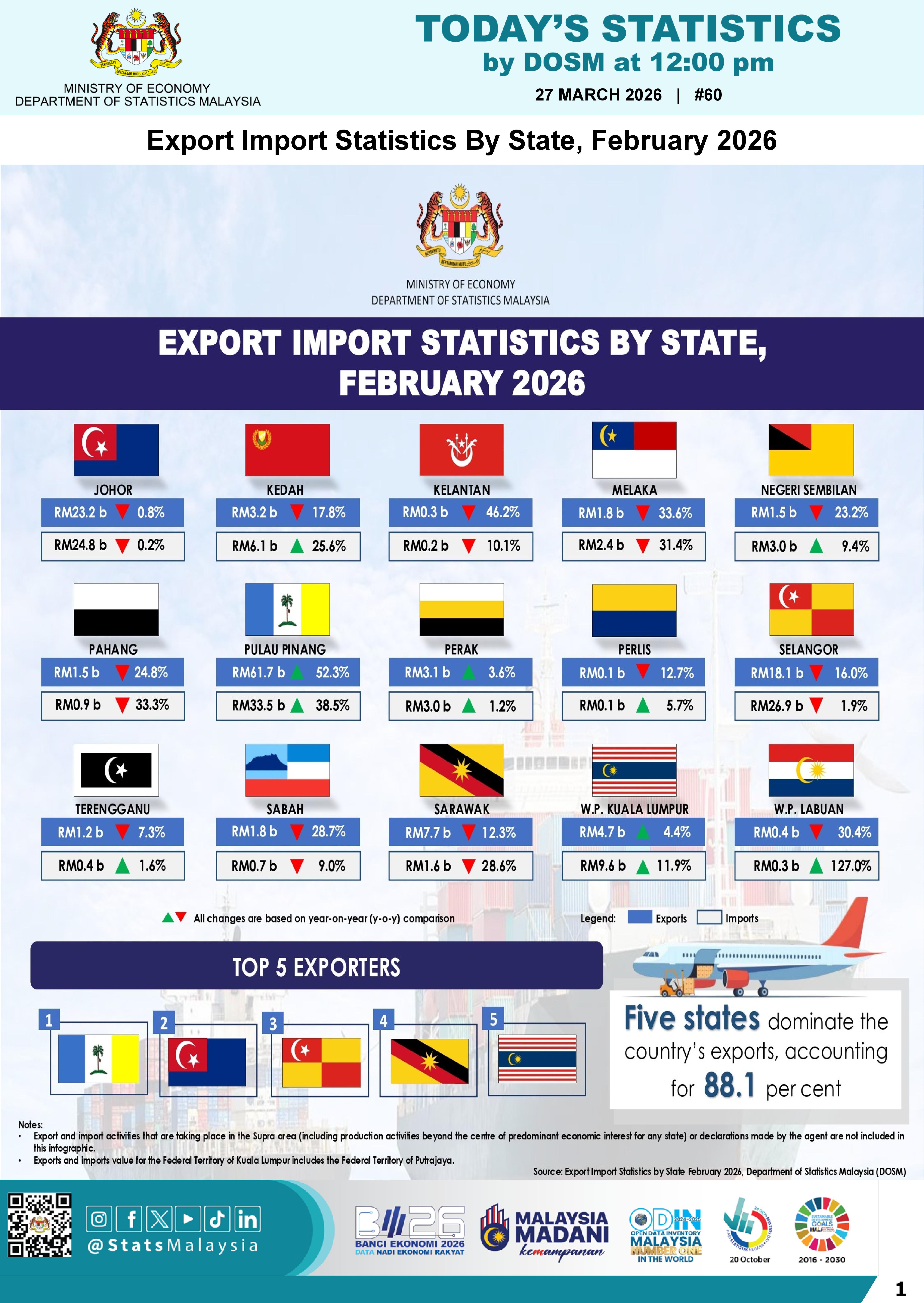 Negeri Sembilan imports were RM255.4 million higher at RM3.0 billion, while Labuan rose RM140.4 million to RM300 million, and Perak increased RM35.9 million to RM3.0 billion. Terengganu’s imports were RM6.8 million higher at RM400 million, and Perlis added RM5.0 million to its import bill to RM100 million.