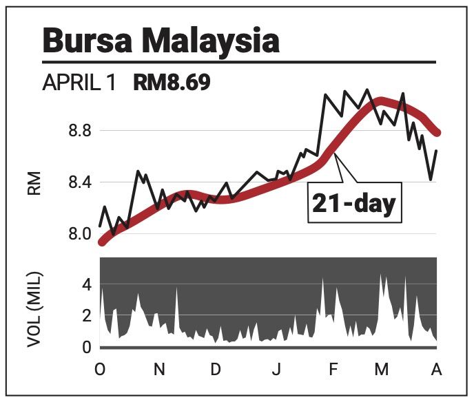 The counter has crossed above the 100-day SMA line and is looking to reclaim RM8.70 and a recent closing high of RM9.11.