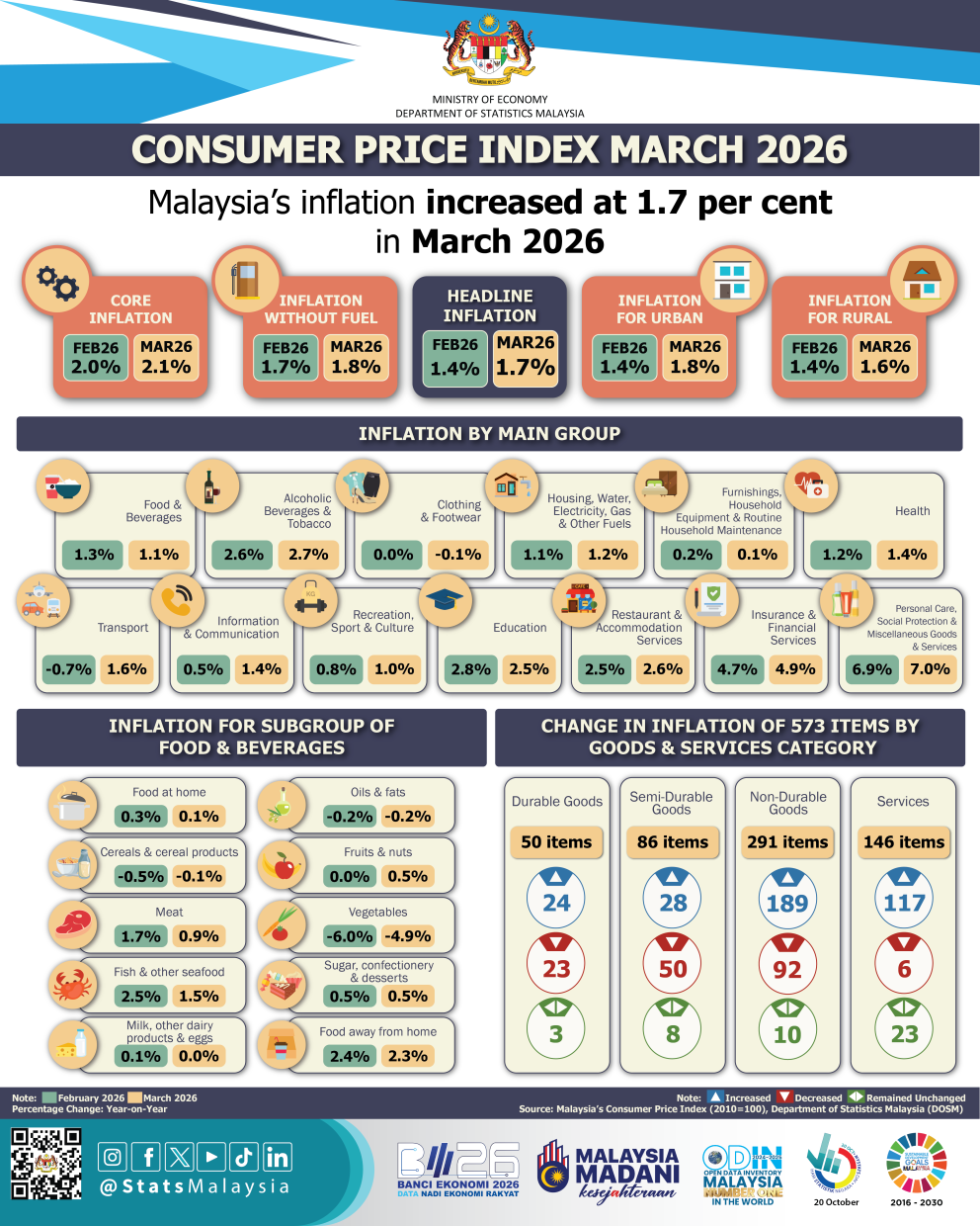 According to DOSM, the insurance and financial services group recorded 4.9 per cent (February 2026: 4.7 per cent); alcoholic beverages and tobacco, 2.7 per cent (February 2026: 2.6 per cent); restaurant and accommodation services, 2.6 per cent (February 2026: 2.5 per cent); health, 1.4 per cent (February 2026: 1.2 per cent); information and communication, 1.4 per cent (February 2026: 0.5 per cent); housing, water, electricity, gas and other fuels, 1.2 per cent (February 2026: 1.1 per cent); and recreation, sport and culture, 1.0 per cent, (February 2026: 0.8 per cent).